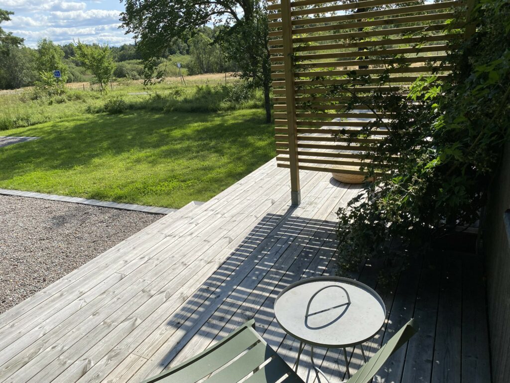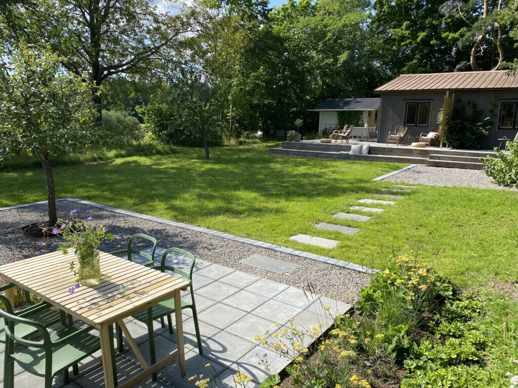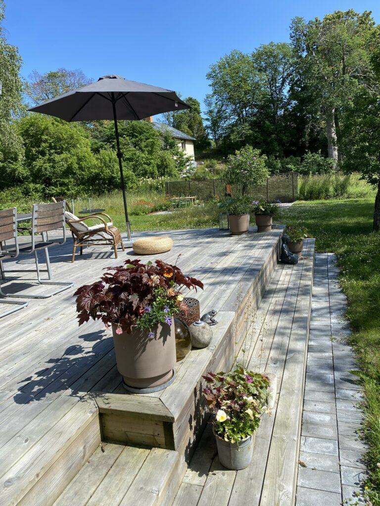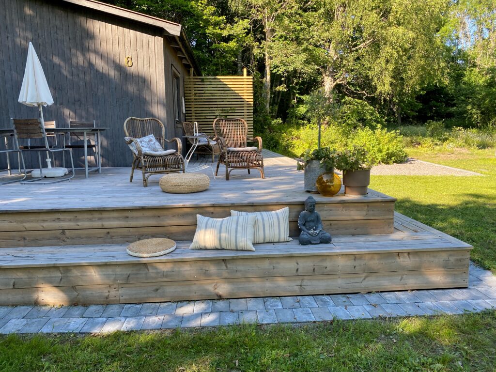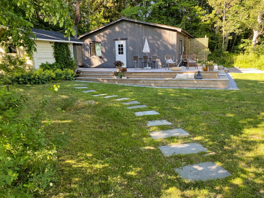 Huset rustas upp både utvändigt och invändigt under 2021-2024; men fokuset här blir på utomhusytorna. Fasaden panelas om, med brädor som stryks med tjärvitriol; vilket skyddar träet bättre än järnvitriol, och får en vacker brungrå nyans som ligger nära naturens. Den gamla terrassen rivs och en ny, dubbelt så stor, byggs efter mina ritningar. Utedasset ersätts av mulltoalett och dusch inne och på dess ställe byggs ett stort förråd, där alla verktyg, maskiner och cyklar får plats – och Friggeboden kan avlastas och äntligen bli enbart gäststuga. En uteplats på kvällssolsplatsen anläggs, spaljéstaket och fortsatt plantering med bl a Molinia-gräs ger Trygg rygg och insynsskydd. Att så här rama in tomten är något jag längtat efter i alla år…