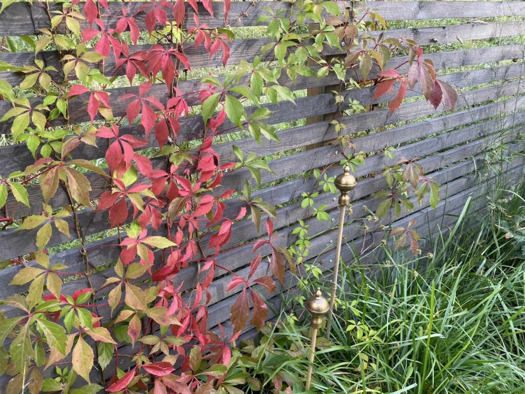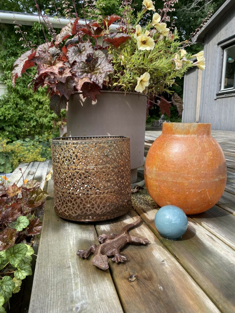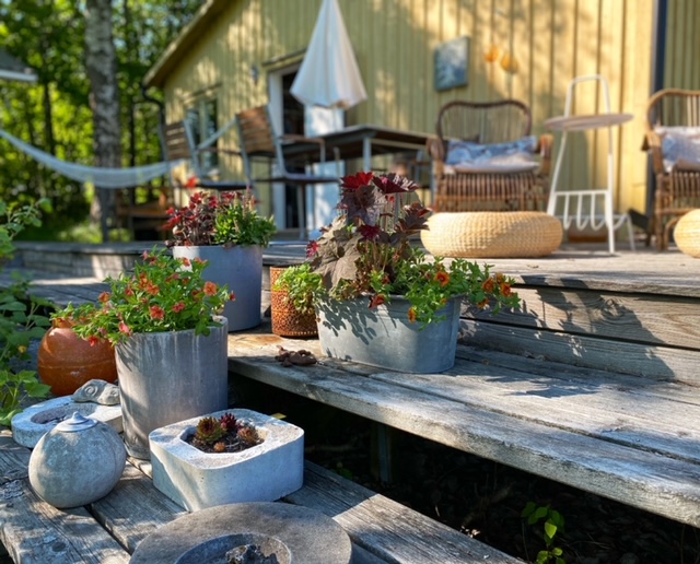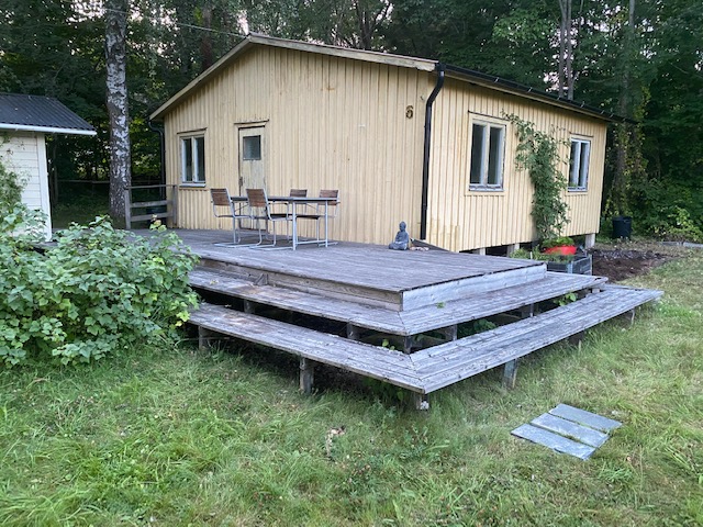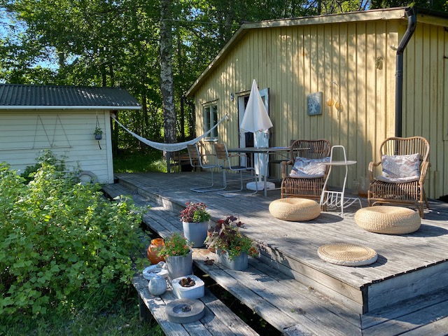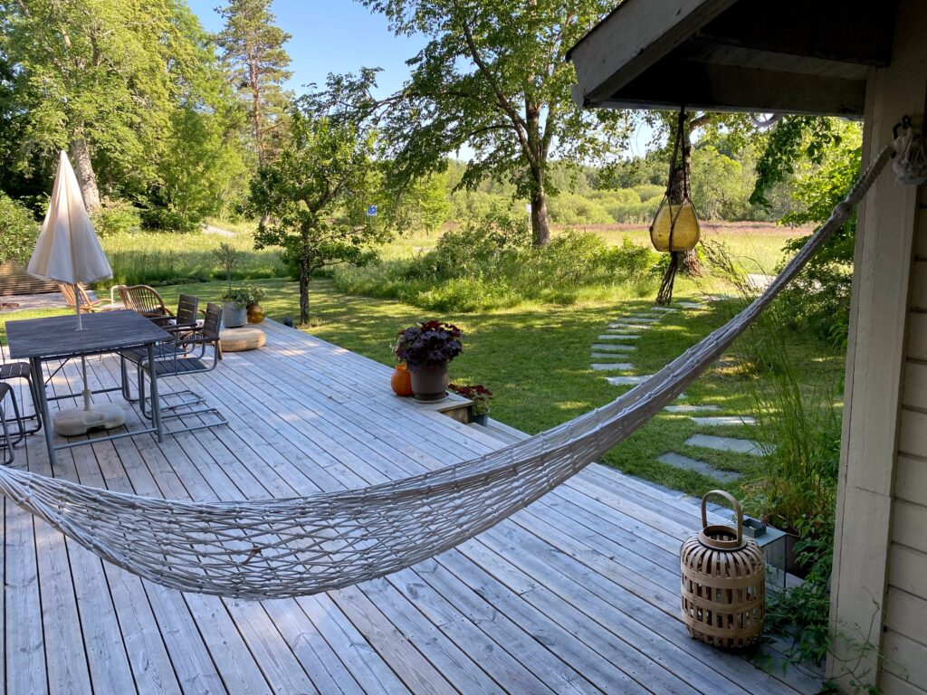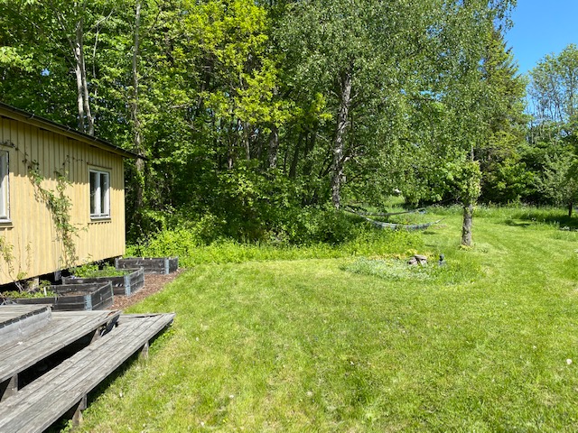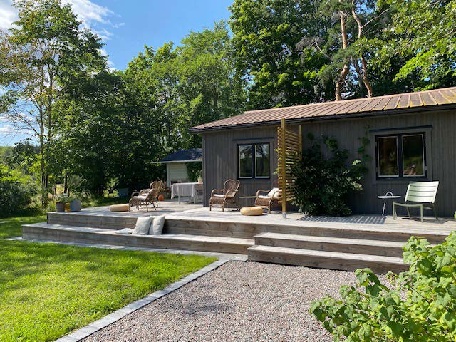 Huset rustas upp både utvändigt och invändigt under 2021-2024; men fokuset här blir på utomhusytorna. Fasaden panelas om, med brädor som stryks med tjärvitriol; vilket skyddar träet bättre än järnvitriol, och får en vacker brungrå nyans som ligger nära naturens. Den gamla terrassen rivs och en ny, dubbelt så stor, byggs efter mina ritningar. Utedasset ersätts av mulltoalett och dusch inne och på dess ställe byggs ett stort förråd, där alla verktyg, maskiner och cyklar får plats – och Friggeboden kan avlastas och äntligen bli enbart gäststuga. En uteplats på kvällssolsplatsen anläggs, spaljéstaket och fortsatt plantering med bl a Molinia-gräs ger Trygg rygg och insynsskydd. Att så här rama in tomten är något jag längtat efter i alla år…