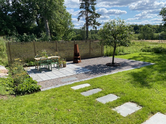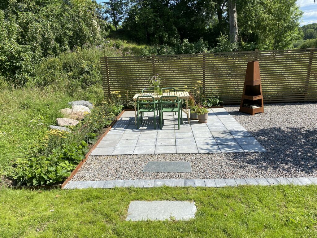 En utökad odlingsyta för pallkragar anläggs med samma singel som på uteplatsen, dit även den stora vinbärbusken från framsidan flyttas.